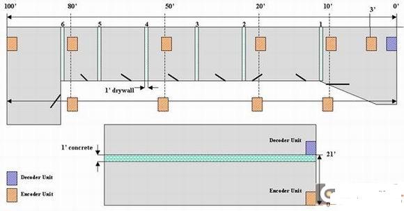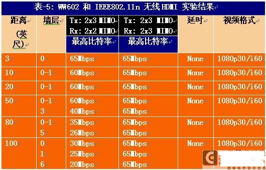 相對于可視距離的無線通信的應(yīng)用,802.11n可實(shí)現(xiàn)更遠(yuǎn)距離的(非可視距離)的多媒體通信,比如在家里的不同房間之間的音視頻通過無線播放。我們用標(biāo)準(zhǔn)的802.11的產(chǎn)品用來測試,證明魯棒性很好,可以穿越墻壁和混凝土樓板,圖-1是測試環(huán)境圖示,用SONY的PS3游戲機(jī)作為高清的視頻源,源和顯示設(shè)備之間距離100英尺并穿越6面墻,視頻的內(nèi)容包括游戲和電影視頻。表5是測試結(jié)果,一組是編碼端和解碼端都是2x3MIMO(2個(gè)發(fā)送天線和3個(gè)接收天線)的無線設(shè)備,另一組采用編碼端2x3MIMO,接收端2x2MIMO的無線設(shè)備。WW602編碼用20Mbps碼流的圖像質(zhì)量可超越高清電纜傳輸?shù)?-15Mbps的圖像質(zhì)量。