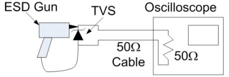 比較保護(hù)二極管鉗位電壓的最佳途徑是采用示波器來對(duì)發(fā)生ESD事件期間通過二極管的實(shí)際電壓波形進(jìn)行屏幕截圖。這可以通過圖1所示的測(cè)試設(shè)置來實(shí)現(xiàn)。[page]