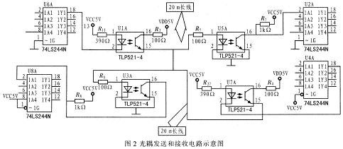在長(zhǎng)線(xiàn)傳輸中,正是因?yàn)榈鼐€(xiàn)的交流阻抗特性,使得地線(xiàn)成了電路中事實(shí)上的最大噪聲源。地線(xiàn)造成干擾的主要原因是地線(xiàn)存在阻抗,當(dāng)電流流過(guò)地線(xiàn)時(shí),會(huì)在地線(xiàn)上產(chǎn)生電壓,這就是地線(xiàn)噪聲。在這個(gè)電壓的驅(qū)動(dòng)下,會(huì)產(chǎn)生地線(xiàn)環(huán)路電流,形成地環(huán)路干擾。南于發(fā)送和接收設(shè)備共用一段地線(xiàn),會(huì)形成公共阻抗耦合。采用光電隔離器TLP521-4對(duì)發(fā)送和接收設(shè)備進(jìn)行電氣隔離,對(duì)于減小交流阻抗的作用十分明顯,進(jìn)而增大傳輸電流,有效地抑制地線(xiàn)噪聲;同時(shí)由于74LS244N的應(yīng)用??偩€(xiàn)驅(qū)動(dòng)能力得到保障。圖2為光耦發(fā)送和接收電路示意圖。圖2中,上半部?jī)晒怦钭宰笙蛴覀鬏斝盘?hào),下半部?jī)晒怦钭杂蚁蜃髠鬏斝盘?hào),左端74LS244N通過(guò)靜態(tài)存儲(chǔ)器IDT7132與處理器進(jìn)行數(shù)據(jù)交換,右端通過(guò)8255與處理器進(jìn)行數(shù)據(jù)交換。