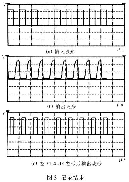 調(diào)試中,輸入周期為100μs,占空比為1/2的+5V方波,對(duì)一路光耦的輸入端波形和經(jīng)過(guò)20m長(zhǎng)線(xiàn)后接收光耦的輸出端波形以及經(jīng)過(guò)74LS244整形后的波形進(jìn)行記錄。記錄結(jié)果如圖3所示。
