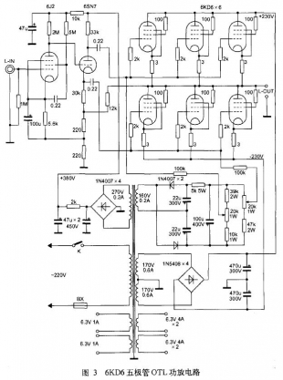 對于普通功率電子管改成三極管接法的OTL功放來說,并不是所有功率管均能采用,必須選用屏極電壓范圍較大的束射四極管或五極功率電子管,如6KD6、6L6、6P3P、6146等。同時,功放級還必須采用多只功率管并聯(lián)的方式,在8Ω低阻抗負(fù)載時,每聲道采用6只功率管并聯(lián)才能符合低阻抗負(fù)載的要求,并且輸出功率僅為30W左右。