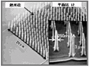 在高寬比納米印刷技術(shù)中,可以簡單地形成直徑為25nm、高3μm(平面比為12)的納米級(jí)柱狀結(jié)構(gòu)集合體(見圖2)。該結(jié)構(gòu)在以往的精密塑料成型中是很難形成的,但使用了高寬比納米印刷技術(shù),用一次壓延就能成型。