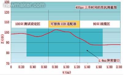 傳播通路中阻抗不連續(xù)性將會(huì)導(dǎo)致反射損失和信號(hào)失真。借助時(shí)域反射計(jì)(TDR),阻抗值可用時(shí)間函數(shù)直接顯示出來(見圖2),以便時(shí)刻監(jiān)測(cè)該數(shù)值是否符合USB系統(tǒng)的規(guī)定系統(tǒng)公差。