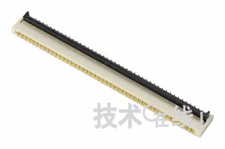 此制品以間距0.3mm、高1.1mm、進(jìn)深4.3mm(滑片鎖上時(shí))尺寸,制成了90引腳的多極連接器。合適的FPC厚度為0.2mm。因采用上下配備接點(diǎn)的構(gòu)造,設(shè)計(jì)時(shí)可無(wú)需考慮插入的FPC接點(diǎn)方向。