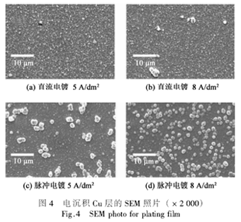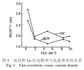 圖1是電沉積Cu層電阻率與電流密度之間的關(guān)系??梢?,脈沖電鍍得到的Cu鍍層電阻率小于相同電流密度下的直流鍍層。在小電流密度時(shí)(<2A/dm2),直流鍍層和脈沖鍍層的電阻率都較大。