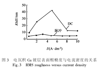 圖3為脈沖電鍍與直流電鍍電沉積Cu鍍層表面粗糙度RMS(rootmeansquare)與電流密度的關(guān)系。可見脈沖所得鍍層表面粗糙度僅為幾個(gè)納米,而直流所得鍍層表面粗糙度在10nm以上,最大時(shí)甚至達(dá)到了40nm,這樣大的粗糙度將為后續(xù)CMP工藝造成極大的困難。而平整的表面可以為CMP工藝提供一個(gè)易于進(jìn)行處理的基底表面,采用脈沖電鍍Cu鍍層的表面粗糙度RMS比直流電鍍的低。
