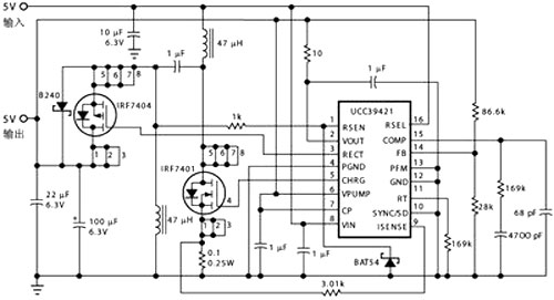 如果USB外設(shè)需要5V電源,事情就稍為有些棘手,因?yàn)閁SB口的外供電壓可能略高于也可能略低于這一數(shù)值。為此,以往常用先升壓再降壓或先降壓再升壓的辦法。這在需要多種輸出電壓的場合,倒也不失為一條可行途徑;但若僅需單一的5V輸出,此類電路結(jié)構(gòu)便難免“疊床架屋”之嫌?;蛟S正是這一緣故,上述之SEPIC盡管電路復(fù)雜,成本也高,但因其能集升壓、降壓功能于一身,所以近來已呈應(yīng)用漸廣之勢。