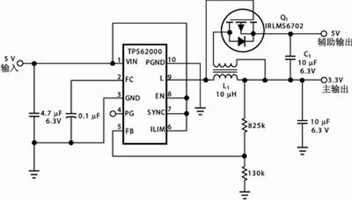 圖2是一種設(shè)計(jì)頗為緊湊的雙電壓輸出電路,工作頻率750kHz,變換效率可達(dá)95%。其中,3.3V主電源由降壓型單片同步開關(guān)電源TPS62000構(gòu)成;該器件具有軟啟動(dòng)功能,能夠有效抑制輸入浪涌電流與輸出電壓過沖,最大輸出電流600mA。TPS62000的輸出端“L”為低電平時(shí),外接P溝道場效應(yīng)管Q1隨之導(dǎo)通而令儲(chǔ)能電感L1副繞組的感應(yīng)電壓向輸出電容C1充電,C1之端電壓同3.3V主輸出疊加即為輔助輸出電壓,其數(shù)值取決于L1主、副繞組的匝數(shù)比;輔助輸出若為5V,匝數(shù)比可取2:1。