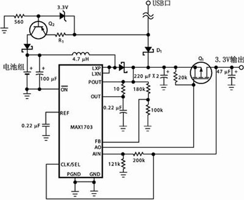 不少便攜式USB設(shè)備脫離主機(jī)后改由內(nèi)部電池組通過直流變換器繼續(xù)供電,故而需要配備一個(gè)小型UPS電源,圖3便是一種由單片開關(guān)電源MAX1703構(gòu)成的實(shí)用電路。該集成器件采用同步整流PWM升壓型電路結(jié)構(gòu);可以單節(jié)鎳鎘/鎳氫電池供電,最低輸入電壓0.7V,輸出電壓可調(diào)范圍為2.5~5.5V,最大輸出電流1.5A,電源變換效率可達(dá)95%。圖3中,MAX1703開關(guān)電源“POUT”端的輸出電壓設(shè)定為3.4V,而由P溝道場效應(yīng)管Q1與片內(nèi)備用放大器構(gòu)成的線性穩(wěn)壓器輸出電壓為3.3V,故而USB外設(shè)由電池組供電時(shí)Q1的功率損耗幾乎可以忽略。外部設(shè)備與USB口接通時(shí),二極管D1為正向偏置而使開關(guān)電源處于“空閑”狀態(tài);也就是只要Q1的源極電壓高于3.4V,外部設(shè)備便始終由USB口供電。與此同時(shí),USB口還通過PNP晶體管Q2等組成的恒流源向電池組充電,調(diào)整電阻R1的阻值可以設(shè)定充電電流,使之符合十小時(shí)充電制的要求。一旦外部設(shè)備脫離USB口,開關(guān)電源便會(huì)立即退出“空閑”狀態(tài)而由內(nèi)部電池組繼續(xù)供電。