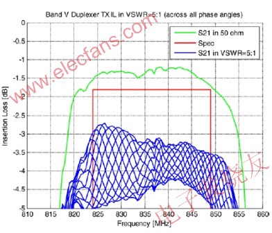 圖3:當(dāng)手機的窄帶雙工或接收濾波器沒有端接到其特征阻抗時,在通帶中也會出現(xiàn)紋波。本例中,VSWR為5:1的阻抗失配使插入損耗大幅度增加。