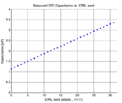 圖6:實測結(jié)果表明,5位DuNEDTC器件具有良好的線性調(diào)諧特性,電容范圍為1.15到3.4pF(調(diào)諧比為3:1)。