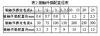 再根據(jù)計(jì)算出的接觸件額定電流值查出接觸件插配直徑(見表2)。