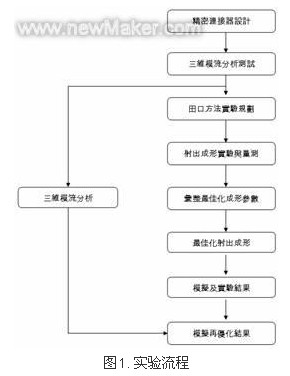 透過(guò)本研究實(shí)驗(yàn)所規(guī)劃之流程(圖1),搭配田口實(shí)驗(yàn)規(guī)劃法,加以探討模流分析與實(shí)際射出成形所得之結(jié)果,是否可有效改善塑料平坦度,進(jìn)而獲得最佳化之射出成形參數(shù)。