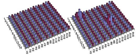圖4為AD7142 CDC和MAX IIZ CPLD相結(jié)合后的2D電容測量結(jié)果,顯示了16條走線,即,對x軸進行了16次劃分。左側(cè)是基線電容測量,而右側(cè)是兩個手指觸摸傳感器后的結(jié)果。圖中藍色和紅色采樣行表示哪一SRC走線被激活。
