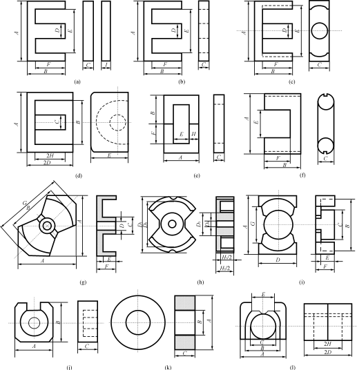 軟磁鐵氧體的鐵心結(jié)構(gòu)比較多,這是由于采用熱壓工藝,比較容易加工成各種形狀。有EI、EE、EER、EP、UF、UYF、RM、PM、PQ、Q(罐形)、T(環(huán)形)和LP形等等(圖8)。EI形以尺寸A(E形鐵心寬度)為標(biāo)志,EE形以尺寸A(E形鐵心寬度)和2×B(E形鐵心長度)為標(biāo)志,已形成EI10~50,EE8.3/8.0~110/80系列,品種多,制造工藝簡單成熟,散熱好,便于引出接線,成本較低。缺點(diǎn)是鐵心中間柱截面為方形,給線圈繞制帶來麻煩。同時,無屏蔽,容易產(chǎn)生雜散磁場干擾。EER形也是以尺寸A(E形鐵心寬度)和2×B(E形鐵心長度)為標(biāo)志,已形成EER25/33~54/50系列,鐵心中間柱截面為圓形,繞線比較方便,同時繞線長度比方形截面縮短11%,從而降低銅損。