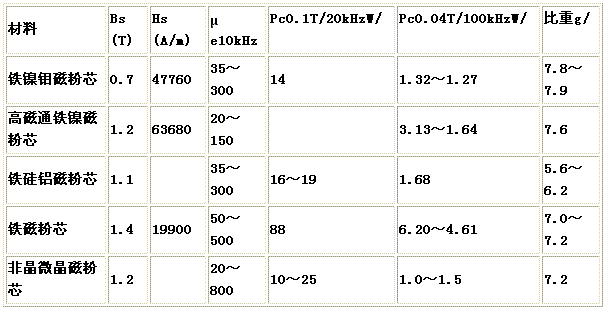 對磁粉芯提出的指標(biāo)有飽和磁通密度Bs、有效磁導(dǎo)率μe、有效品質(zhì)因數(shù)Qe、有效磁導(dǎo)率溫度系αμe及居里點(diǎn)、比重等。主要的磁粉芯的性能參數(shù)如表1所示。鐵鎳鉬磁粉芯國家標(biāo)準(zhǔn)型號為FN81,上海鋼鐵研究所型號為SN,美國阿諾德公司型號為MPP,磁導(dǎo)率高,工作環(huán)境適應(yīng)范圍廣,損耗低,但價格貴。鐵鎳高磁通磁粉芯國家標(biāo)準(zhǔn)型號為FN50,美國阿諾德公司型號為HF,飽和磁通密度高,磁導(dǎo)率中等,損耗也較低,價格較便宜,國內(nèi)外最近比較重視研究和使用。鐵硅鋁磁粉芯上海鋼鐵研究所型號為SA,美國阿諾德公司型號為MS,是一種價格較低,綜合性能指標(biāo)較好的磁粉芯。鐵磁粉芯上海鋼鐵研究所型號SF,國外一般型號為IP,磁導(dǎo)率和飽和磁通密度高,但在高頻下?lián)p耗大,只適用于低頻和20kHz以下的中頻使用。由于價格便宜,可以把它加工成大型磁粉芯,代替硅鋼,作為大容量直流電源的濾波電抗器。