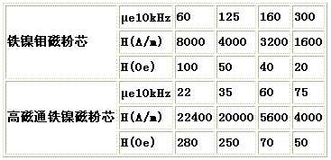 除了表1所列性能而外,一般還給出有效磁導(dǎo)率μe與頻率f的關(guān)系曲線。與軟磁鐵氧體類似,在超過一定極限工作頻率以后,有效磁導(dǎo)率會迅速下降。同時,還給出在有效磁導(dǎo)率μe下降50%的外加磁場強(qiáng)度,也就是恒磁范圍。表2是鐵鎳鉬磁粉芯和高磁通鐵鎳磁粉芯的恒磁范圍。還有,對用于輸出濾波器的磁粉芯,必須給出交直流同時磁化曲線,表示在大的直流磁化條件下,磁粉芯有效磁導(dǎo)率的變化情況。