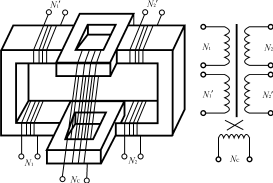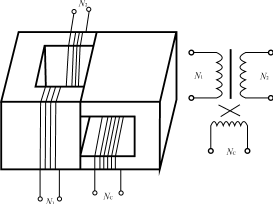 從20世紀(jì)80年代末開始,對由垂直形鐵心構(gòu)成的立體布置的多功能鐵心結(jié)構(gòu)進(jìn)行研究的人員越來越多。最早是有人把C形鐵心的一半轉(zhuǎn)90°而形成的,發(fā)現(xiàn)在沒轉(zhuǎn)90°的C形鐵心上的繞組之間仍存在變壓器功能,轉(zhuǎn)90°的C形鐵心上繞上一個繞組,可以通過電流激磁后,改變沒轉(zhuǎn)90°的C形鐵心上繞組的電感〔見圖11(a)〕。后來把鐵心去掉一些變成圖11(b),仍然具有這樣的功能。圖11(c)是把兩個變壓器和兩個可控電感組合在一起的多功能鐵心結(jié)構(gòu)。