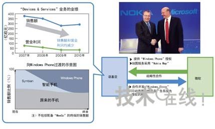 在移動(dòng)產(chǎn)品的全球最大規(guī)模展會(huì)“Mobile World Congress 2011”(2011年2月14~17日)開幕前的2月11日,諾基亞宣布了“歷史性”戰(zhàn)略轉(zhuǎn)換方針。該公司將與美國微軟進(jìn)行戰(zhàn)略合作,合作內(nèi)容包括采用“Windows Phone”作為智能手機(jī)的主要平臺(tái)等(圖1)。