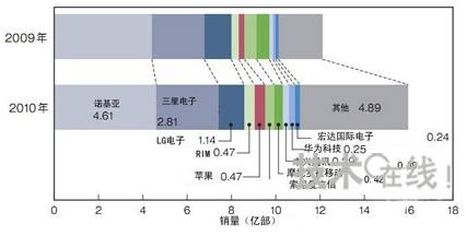 2010年的手機(jī)全球銷量比上年增加31.8%,約為16億部。RIM、蘋果、ZTE、HTC以及華為的銷量順利增長,但LG、索尼愛立信和摩托羅拉移動(dòng)等的銷量則出現(xiàn)減少。(圖:Gartner,2011年2月發(fā)行)