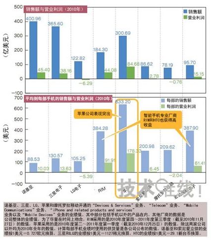 各大廠商的2010年手機(jī)業(yè)務(wù)全年業(yè)績。諾基亞在按銷售額的排名中位居榜首,不過在按營業(yè)利潤的排名中,蘋果以將近2倍的差遙遙領(lǐng)先于位居第二的諾基亞。換算到每部手機(jī)上,蘋果的銷售額和營業(yè)利潤較其他公司高出很多。