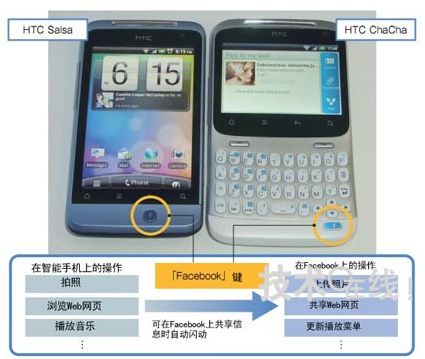 HTC發(fā)布了兩款適合使用SNS“Facebook”的智能手機(jī)。當(dāng)利用攝像頭拍照等預(yù)測用戶想在Facebook上共享信息時(shí),F(xiàn)acebook鍵會(huì)自動(dòng)閃光。摁下該鍵就會(huì)進(jìn)入上傳信息的畫面。