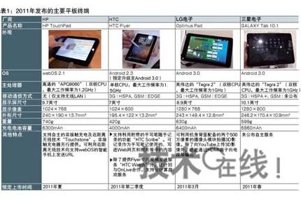 2011年1月,美國摩托羅拉移動(dòng)公司(Motorola Mobility)發(fā)布了配備Android 3.0的平板終端“XOOM”,以此為開端,2011年2月韓國LG電子和三星電子分別發(fā)布了“Optimus Pad”和“GALAXY Tab 10.1”。HTC采用Android 2.3投產(chǎn)的首款平板終端“HTC Flyer”計(jì)劃升級(jí)至Android 3.0(表1)。2010年收購了美國Palm的美國惠普(Hewlett-Packard)也涉足了平板終端市場,并于2011年2月發(fā)布了“HP TouchPad”,采用Palm面向智能手機(jī)OS開發(fā)的“webOS”。