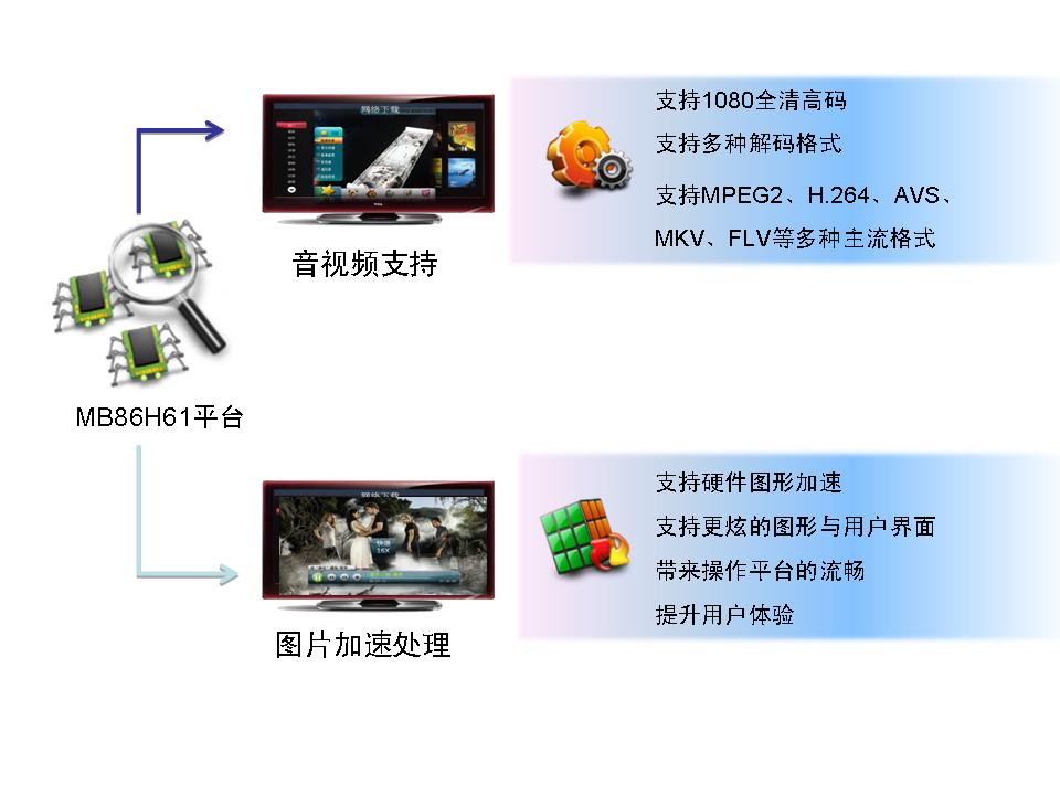 MB86H61系列芯片基于多核CPU架構(gòu),內(nèi)部集成了富士通獨有專利技術(shù)的硬件視頻處理器視頻解碼單元解碼全高清/標(biāo)清MPEG-2、H.264、VC-1、AVS、FLV、MKV等多種視頻格式,而音頻解碼單元則采用高性能的ARC725TM(594DMIPS)支持DD、DD+、AAC、DRA等多種先進音頻格式。因此,該芯片的ARM11內(nèi)核主CPU將全部用于處理應(yīng)用程序,其性能將有足夠的裕量,能充分保證系統(tǒng)運行的平穩(wěn)流暢。“獨立的硬件圖形加速功能還使其能更輕松地支持豐富的圖形用戶界面、高清圖片顯示,從而大大提升用戶體驗。”富士通半導(dǎo)體業(yè)務(wù)發(fā)展總監(jiān)黃自力表示,“該芯片對于全高清AVS視頻解碼的支持尤其值得一提,目前市場上大部分的高清芯片所能支持的AVS解碼還停留在標(biāo)清階段。”