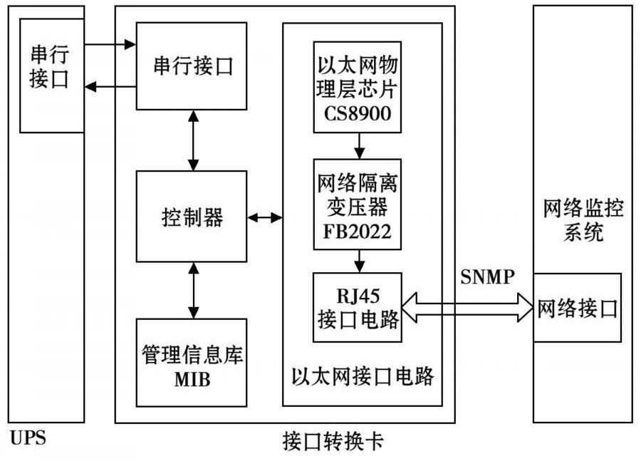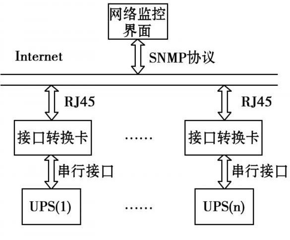 整個(gè)系統(tǒng)的核心為基于SNMP網(wǎng)絡(luò)管理協(xié)議的接口轉(zhuǎn)換卡。接口轉(zhuǎn)換卡一端通過(guò)網(wǎng)線與監(jiān)控計(jì)算機(jī)相連,管理人員通過(guò)計(jì)算機(jī)可方便地對(duì)其進(jìn)行操作。接口轉(zhuǎn)換卡另一端通過(guò)與UPS上的串行接口連接,來(lái)獲取UPS工作的各種信息及參數(shù),然后再利用SNMP協(xié)議將接收到的數(shù)據(jù)轉(zhuǎn)換為管理信息庫(kù)(MIB)節(jié)點(diǎn)的變量值。管理員通過(guò)網(wǎng)絡(luò)管理軟件對(duì)MIB節(jié)點(diǎn)變量進(jìn)行操作,從而獲得各UPS的監(jiān)控信息,實(shí)現(xiàn)了安全可靠的遠(yuǎn)程分散式管理。