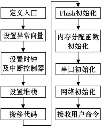 本設(shè)計(jì)中采用了帶有SNMP協(xié)議的μClinux操作系統(tǒng),實(shí)現(xiàn)方式簡(jiǎn)單。不僅完成了串行接口到網(wǎng)絡(luò)接口的轉(zhuǎn)換,還使用戶可以通過(guò)監(jiān)控界面按照SNMP協(xié)議標(biāo)準(zhǔn)進(jìn)行統(tǒng)一管理。對(duì)于μClinux系統(tǒng)U-boot是最合適的Bootloader,其設(shè)計(jì)過(guò)程如圖5所示。