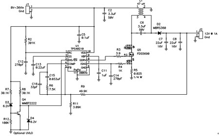 構(gòu)建起如圖3 所示電路,并對(duì)其進(jìn)行描述。該電路可在汽車市場(chǎng)獲得應(yīng)用。這里,其擁有一個(gè)8V 到36V 的寬范圍輸入,可以為穩(wěn)定12-V 輸出以上或者以下。汽車市場(chǎng)更喜歡使用陶瓷電容器,原因是其寬溫度范圍、長(zhǎng)壽命、高紋波電流額定值和高可靠性。結(jié)果,耦合電容器(C6) 便為陶瓷的。這就意味著,相比電解電容器,它擁有較高的AC 電壓,同時(shí)這種電路會(huì)對(duì)低漏電感值更加敏感。