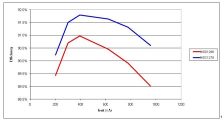 圖5 由于更少的電流,高漏電感(MSC1278) 產(chǎn)生更高的效率