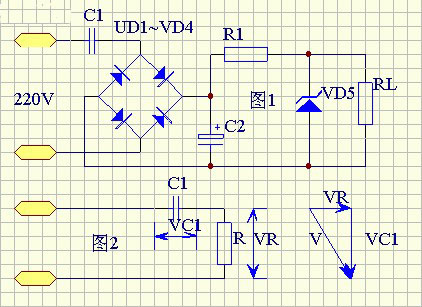 最簡(jiǎn)單的電容降壓直流供電電路及其等效電路如圖1,C1為降壓電容,一般為0.33~3.3uF。假設(shè)C1=2uF,其容抗XCL=1/(2PI*fC1)=1592。由于整流管的導(dǎo)通電阻只有幾歐姆,穩(wěn)壓管VS的動(dòng)態(tài)電阻為10歐姆左右,限流電阻R1及負(fù)載電阻RL一般為100~200,而濾波電容一般為100uF~1000uF,其容抗非常小,可以忽略。若用R代表除C1以外所有元器件的等效電阻,可以畫(huà)出圖2的交流等效電路。同時(shí)滿足了XC1>R的條件,所以可以畫(huà)出電壓向量圖。
