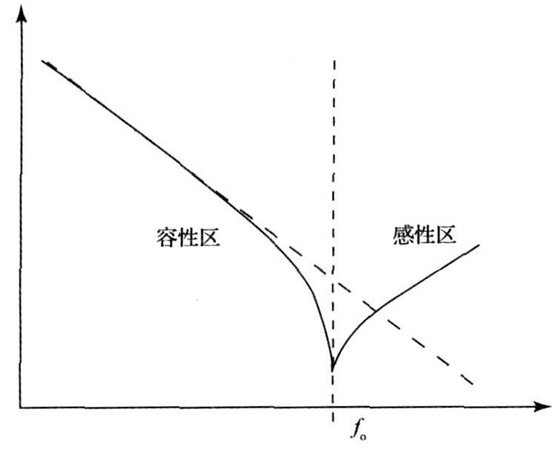 其中C 為實際電容本身的標(biāo)稱電容, L 是其寄生電感, Rp是其并聯(lián)等效電阻, Rs 是其串聯(lián)等效電阻。寄生電阻會對經(jīng)過電容的信號造成衰減, 但不會影響電容本身的頻率特性。寄生電感會與電容構(gòu)成串聯(lián)諧振回路, 會使實際的電容在某個頻率上發(fā)生諧振, 這種現(xiàn)象稱為電容的自諧振 。實際電容的阻抗和頻率特性曲線如圖2 所示。