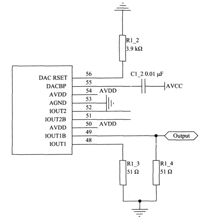 掃頻發(fā)生器在本系統(tǒng)中產(chǎn)生寬頻帶掃頻信號以激勵待測電容, 當(dāng)電容較大時,以常見的電解電容為例,假設(shè)電容為1 000 F, 其寄生電感為100 nH, 則按照式(1)可計算出其自諧振頻率為15. 9 kHz, 諧振頻率較低;另以瓷片電容為例, 假設(shè)其電容值為10 pF, 寄生電感約為10 nH, 則其自諧振頻率為500 MHz 這兩個信號頻率相差了4 個數(shù)量級, 這就需要1 個寬帶的信號發(fā)生器, 這也是本部分的設(shè)計難點所在。若采用傳統(tǒng)的模擬信號發(fā)生的方法, 為了實現(xiàn)信號頻率的可調(diào), 一般會采用變?nèi)荻O管構(gòu)成的LC 振蕩器, 然而在信號頻率較低時, 所需要的變?nèi)荻O管的電容量會很大,而傳統(tǒng)的變?nèi)荻O管電容值一般只是幾個pF 至幾百pF ,很難滿足低頻振蕩要求。為了簡化掃頻電路, 以及實現(xiàn)數(shù)字化控制, 這里采用DDS 技術(shù)產(chǎn)生寬帶信號。DDS 采用的是DA 轉(zhuǎn)換器的原理, 通過計數(shù)器累加實現(xiàn)的連續(xù)波形輸出 , 而DDS 芯片外圍電路簡單, 通過寫它的寄存器便可實現(xiàn)信號頻率的調(diào)節(jié), 同時產(chǎn)生的信號頻率分辨率高,一般可以達(dá)到0. 01 Hz 級別, 信號頻率的跨度大, 可以實現(xiàn)從幾Hz 到幾百M(fèi)Hz 的連續(xù)信號, 非常適合做掃頻發(fā)生器。這里采用了AD9854 這款DDS 芯片, 它在300 MHz 時鐘驅(qū)動下, 按照乃奎斯特采樣定律可以產(chǎn)生最高150 MHz 的信號,為了得到信號較好的頻率則一般只得到最高100 MHz 的信號。若要得到高于100 MHz 的信號, 則可采用其高次諧波得到?;贏D9854 的信號發(fā)生電路如圖4 所示。限于篇幅,僅畫出了關(guān)鍵的輸出部分和電流設(shè)置部分。AD9854 內(nèi)置4~ 12 倍頻的時鐘倍頻器, 因此可以外加1 個較低頻率的時鐘,通過倍頻器倍頻至300 MHz, 這樣可以極大的降低高速片外時鐘對系統(tǒng)造成的電磁兼容性問題。AD9854 內(nèi)部有1個頻率控制字寄存器,通過寫該寄存器的值便可以改變輸出信號的頻率, 非常適合數(shù)字控制。同時由于時鐘采用的時晶體振蕩器,因此輸出頻率的穩(wěn)定度和分辨率都非常高, 一般為10- 6數(shù)量級。