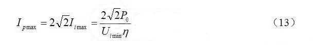 為避免音頻噪聲,在輸入電壓范圍內(nèi),開關(guān)頻率應(yīng)在20kHz以上。從以上分析可知,在最高輸入電壓峰值時,開關(guān)頻率最低。故假定在最高輸入電壓峰值的開關(guān)周期為50μs.由式(11)求得