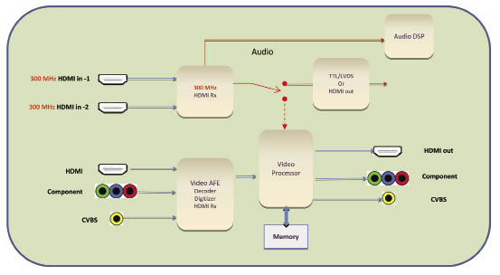 以4K系統(tǒng)為例,圖1所示的是一個(gè)典型的支持4K的系統(tǒng)。支持300MHz的接口由HDMI來(lái)實(shí)現(xiàn)。系統(tǒng)接收了4K的信號(hào)后,可以以兩種方式處理: