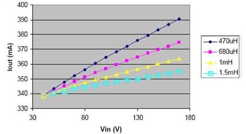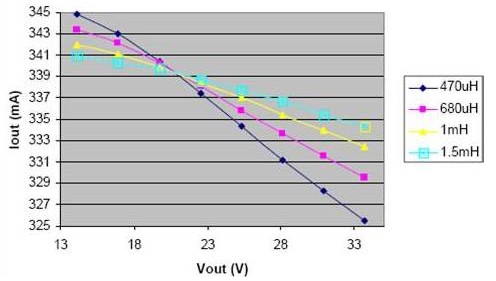上圖是不同電感值下的頻率響應(yīng)。下圖說明了電感減小時,在輸入電壓的變化范圍內(nèi),負載電流的變化明顯增大。