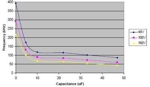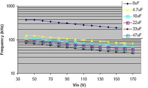 輸出可同時使用輸出電容以達到目標頻率和電流的精確控制。電容能在整個輸入電壓范圍內(nèi)減小頻率,一個小的 4.7μF 的電容就能顯著減小頻率。電流的調(diào)整也能因為電容值的增加而得到改善。從下面圖片可以很容易看到,圖上存在一個拐點,再增加電容值,對操作頻率和輸出電流的調(diào)整影響不大。