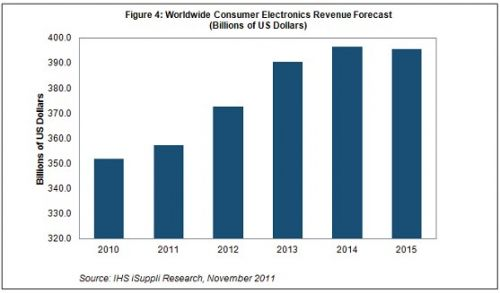 但不都是負(fù)面消息。雖然第二和第三季度的消費(fèi)電子營(yíng)業(yè)收入低于去年同期水平,但隨著電視與藍(lán)光播放器假日銷售高于2010年水平,上述趨勢(shì)將從第四季度開始逆轉(zhuǎn)。IHS公司認(rèn)為,預(yù)計(jì)2012和2013年增長(zhǎng)率將超過4%,相比于當(dāng)前的低迷狀態(tài),屆時(shí)多數(shù)消費(fèi)電子領(lǐng)域?qū)?huì)恢復(fù)活力。