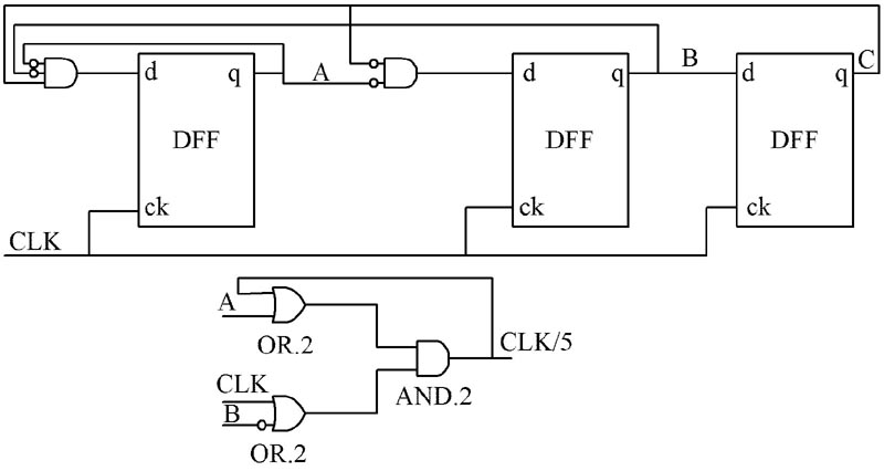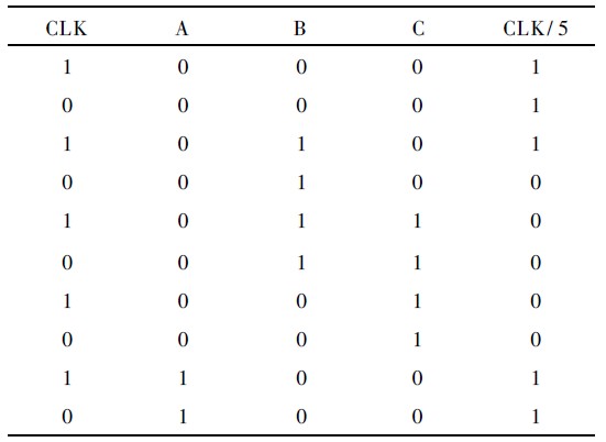 采用基于D 觸發(fā)器結構的五分頻器邏輯框圖如圖1所示。圖1 由3 個D 觸發(fā)器和少量邏輯門構成, 采用了同步工作模式, 其原理是由吞脈沖計數(shù)原理產(chǎn)生2 個占空比不同的五分頻信號A 和B, 然后對時鐘信號CLK, A 和B 進行邏輯運算得到占空比為50% 的五分頻信號CLK/ 5, 其計數(shù)過程如表1 所示, 從表1 的計數(shù)過程可知, 分頻后的時鐘CLK/ 5 的周期是輸入時鐘CLK 的5 倍, 由此實現(xiàn)了五分頻并且其占空比為50% .