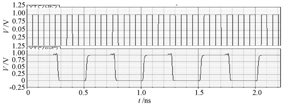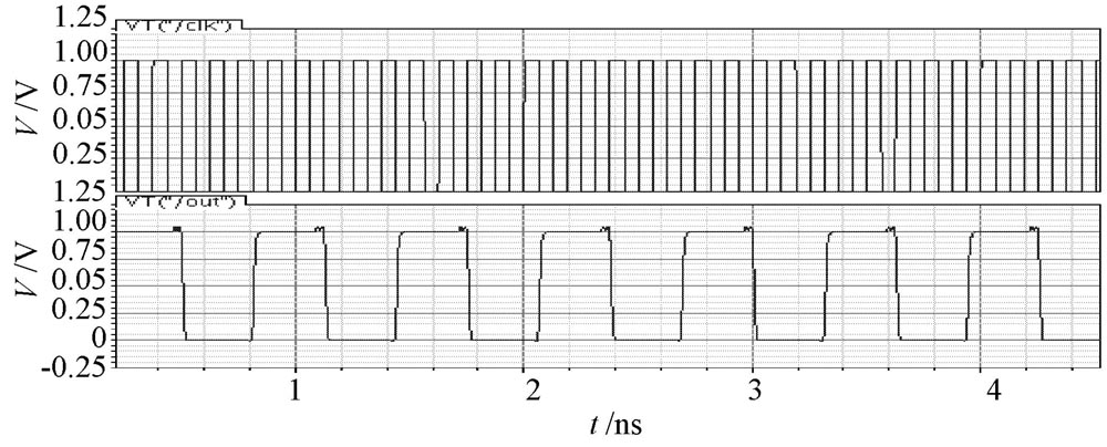 采用Cadence 公司的spect re 仿真器對設計的分頻器分別仿真, 仿真電源電壓為1 V, 結果表明: 在典型工藝參數(shù)條件下,基于CML 電路結構的五分頻器最大工作頻率是8 GHz, 最小工作頻率是1 kHz, 當工作在8 GHz 時, 功耗為1. 7 mW, 輸出信號占空比為49. 76% ; 基于T SPC 電路結構的五分頻器最大工作頻率是10 GHz, 最小工作頻率是10 MHz, 當工作在10 GH z時, 功耗采用10 ns 內(nèi)的平均功耗, 功耗為0. 2 mW, 輸出信號占空比為49. 92%.由于是單端輸入輸出, 基于T SPC 電路結構的分頻器抗噪聲能力較弱。最高工作頻率下的仿真結果如圖4, 圖5 所示。