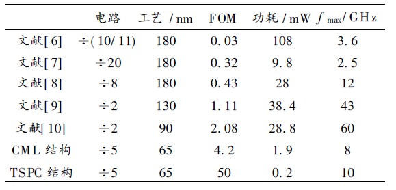 式中: fmax 是分頻器的最高工作頻率; P 是分頻器在最高工作頻率下的功耗, 表2 為本文設計的分頻器和其他文獻中介紹的分頻器作對比,所有的分頻器均采用CMOS工藝, 對比表明本文設計的5 分頻器性能較優(yōu),在65 nm 工藝下具有明顯的功耗低優(yōu)勢, 尤其是采用TSPC 電路結構的分頻器, 功耗極低。