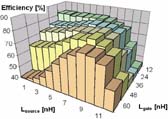 該結(jié)果的解釋需要進一步研究。現(xiàn)在我們可以說明,在電路板合理的電感值范圍內(nèi),漏極和源極電感必須減小,以確保高的轉(zhuǎn)換器效率。該仿真得出如下結(jié)果: