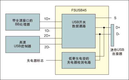 圖2:帶充電器檢測功能的USB開關(guān)非常適合高速USB應(yīng)用,其USB電源和數(shù)據(jù)端口是共享的。