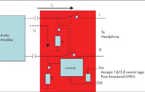這種開關(guān)很適合單個USB連接器(D+/D-引腳)被耳機和USB數(shù)據(jù)線共享的手機和MP3/MP4播放機采用。低的總諧波失真(THD)對音頻聲道來說非常重要。另外,由于開關(guān)被安放在交流耦合電容器之后,因此必須處理低THD下很大的反向信號擺幅。這種開關(guān)的超低關(guān)斷電容允許高速USB信號借助該器件進行“線或”連接。而較低的寄生電容也是高速USB 2.0標(biāo)準的一致性測試的關(guān)鍵。