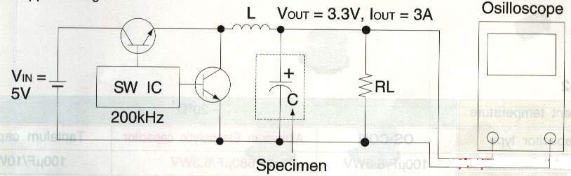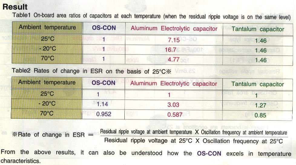 而上圖的表格則表明了,在L/C部分使用不同種類電容的情況下,這個(gè)電路中漣波電壓的表現(xiàn)情況??梢钥闯?,具有LOW ESR性能的鋁固體聚合物導(dǎo)體電容(左邊),其消除漣波電壓的性能最強(qiáng),鉭二氧化錳電容(右邊)性能次之,鋁電解液電容(中間)表現(xiàn)最差。同時(shí)最后的數(shù)值還將受溫度影響,這點(diǎn)我們還將在后面詳細(xì)說(shuō)明。