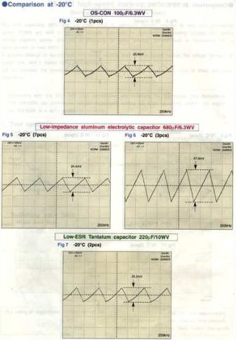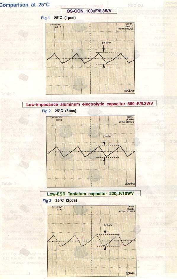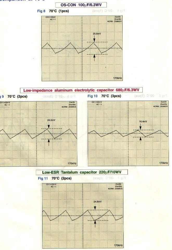 上圖代表25攝氏度下,三種電容降低漣波電壓的能力(電路可以以上一章節(jié)中的電路圖為參考)。其中第一個(gè)表格所使用的OSCON SVP鋁固體聚合物導(dǎo)體電容(1顆,100μF,ESR=40毫歐姆) ),第二個(gè)表格所使用的是低阻抗鋁電解液電容(3顆并聯(lián)),第三個(gè)表格使用的是低阻抗鉭電容(2顆并聯(lián))。
