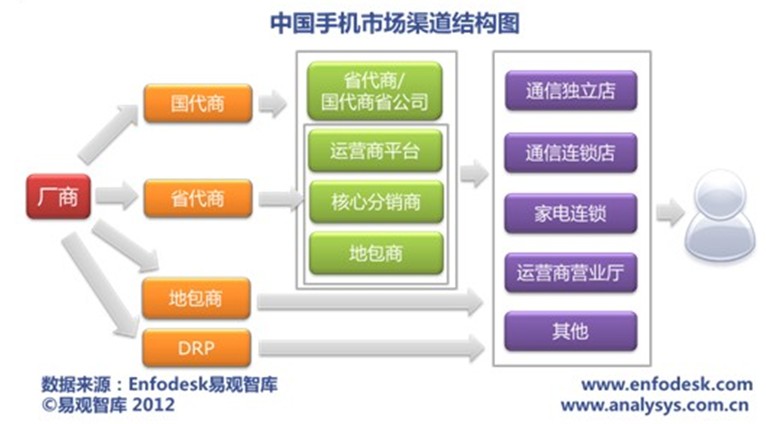 根據(jù)易觀智庫分析,目前我國手機市場渠道開始進入轉(zhuǎn)型期。首先一個比較明顯的變化是手機廠商直供模式的加強,渠道的扁平化趨勢進一步加劇。比較明顯的一個例子是三星手機的渠道改革,從2010年12月起,三星手機全面推行了直供模式,經(jīng)過一年多的發(fā)展,三星對手機渠道的把控能力不斷得到了提升。