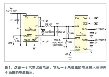 IC2將IC1產(chǎn)生的5V分配給兩個輸出端。它不僅要分配電源,也要為過載提供保護。大多數(shù)便攜設(shè)備都是通過USB(通用串行總線)接口獲得電源或進行充電,USB口的電流限制為500 mA。由于IC2面向USB應(yīng)用,因此它會鎖定任何試圖提供500 mA以上電流的端口,而不影響到其它端口。它有自動重啟功能,可在消除過載條件后,確保端口的自動恢復(fù)?! ?br />